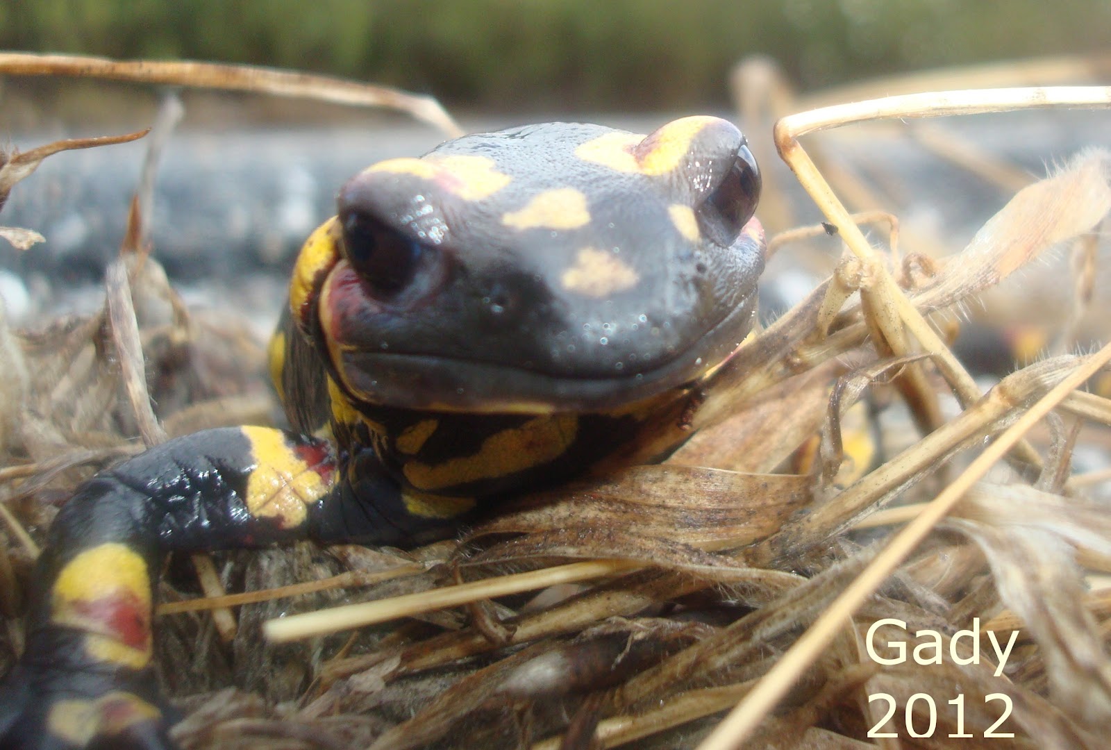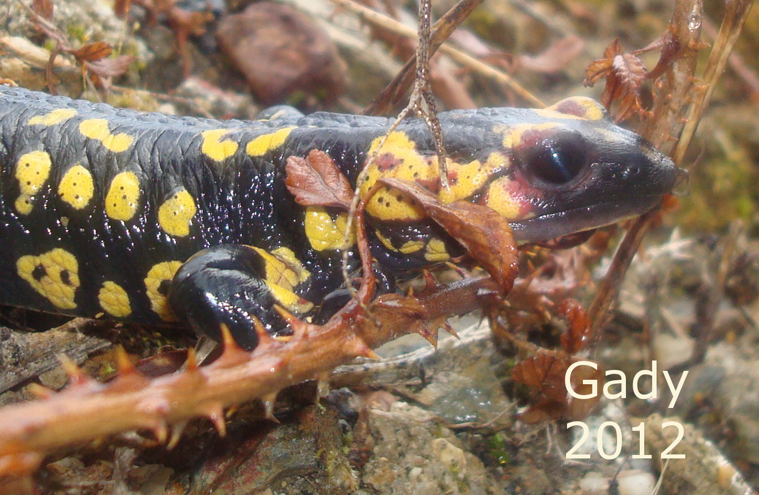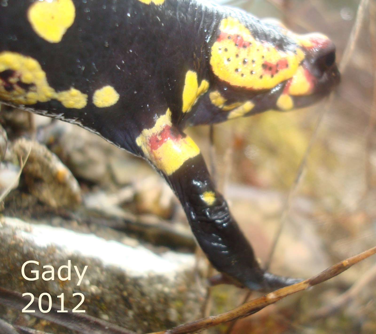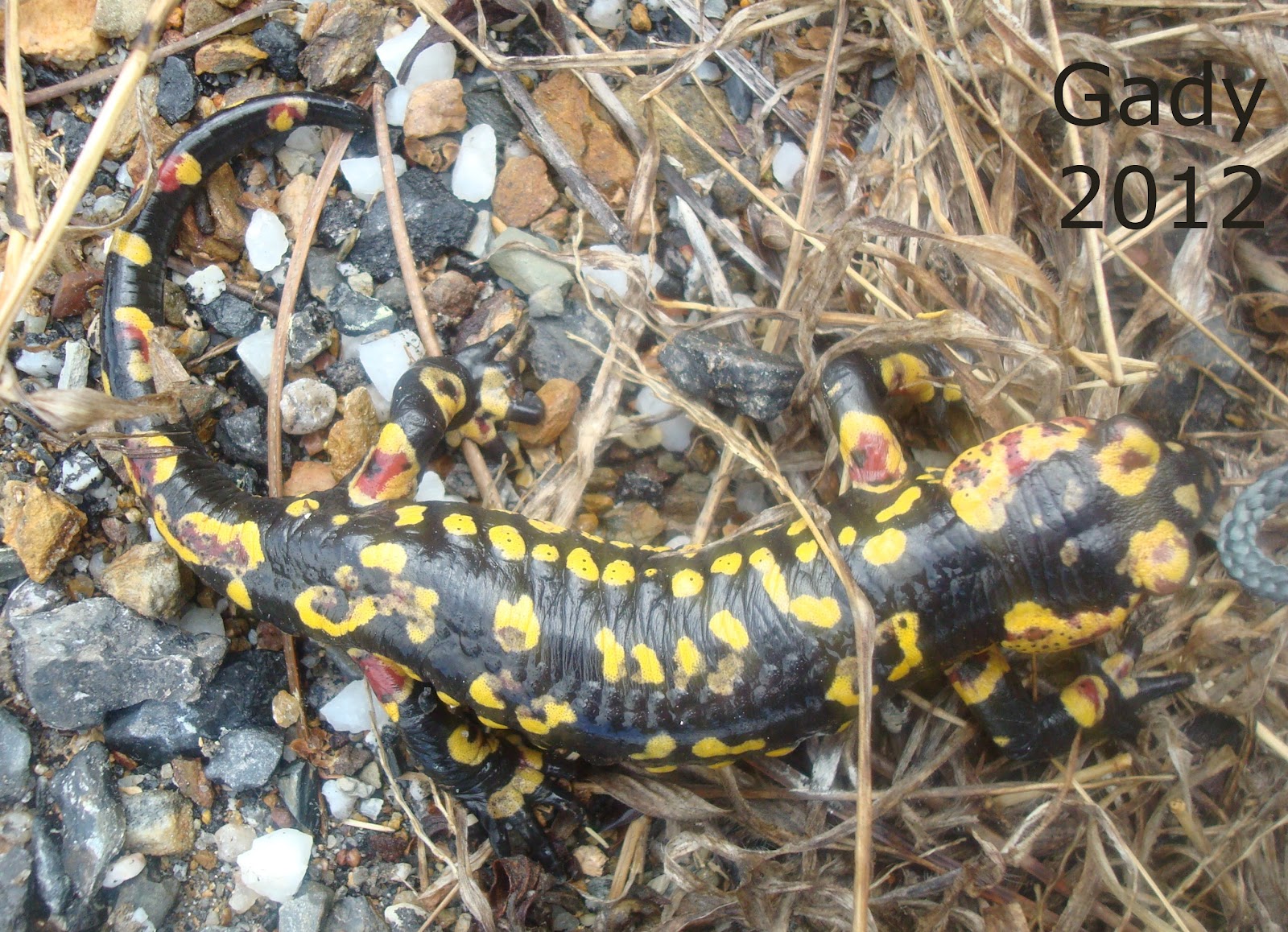 Há dois dias, quando ia a caminho de Proença-a-Nova, voltei-me a cruzar com uma salamandra-de-fogo! Depois de um Inverno seco e frio, começaram os dias de chuva e no meio da estrada algo caminhava… parei o carro para observar melhor e ainda bem que levava comigo a máquina fotográfica, assim posso publicar aqui algumas fotografias…