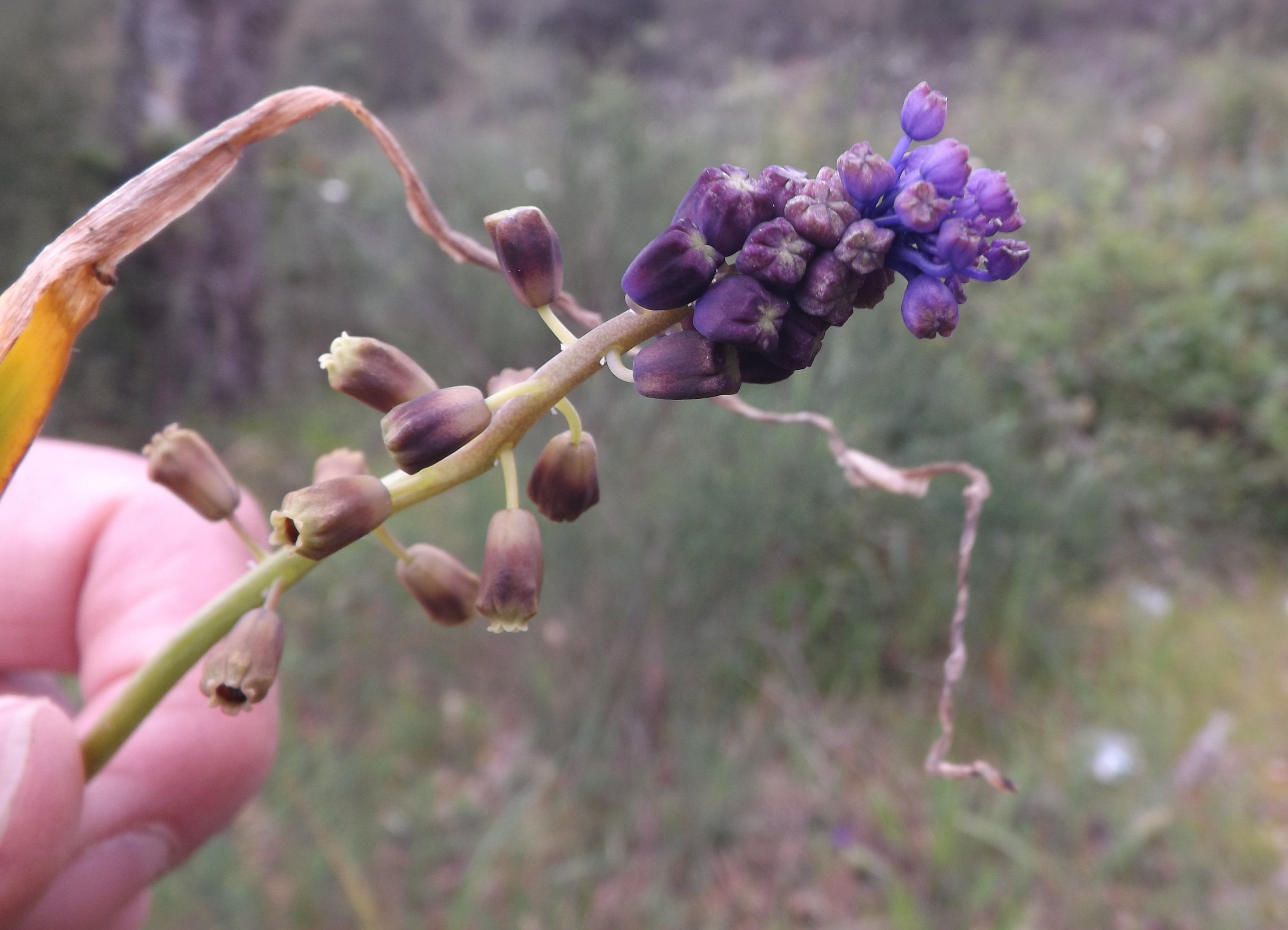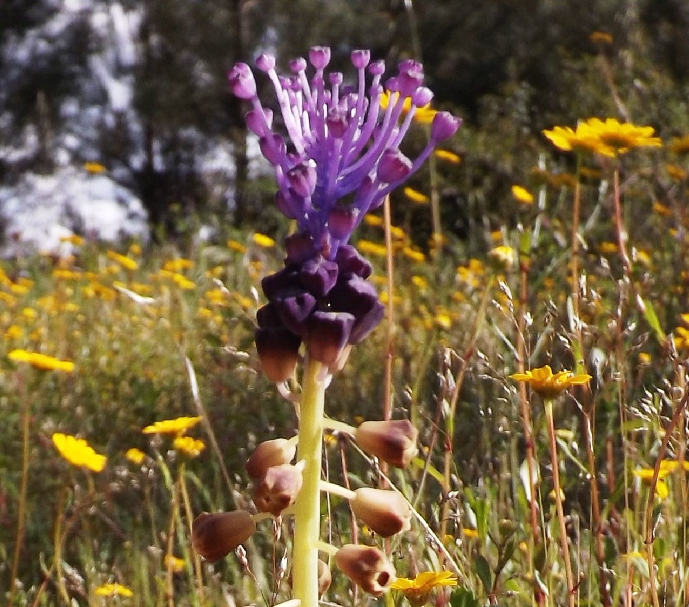 O jacinto-das-searas_Muscari comosum pertence á família Asparagaceae e ao género Muscari. Está em floração mais ou menos conforme o clima entre o final de Fevereiro e final de Junho, visto ser uma bolbosa, no resto do ano é uma planta muito mais discreta.