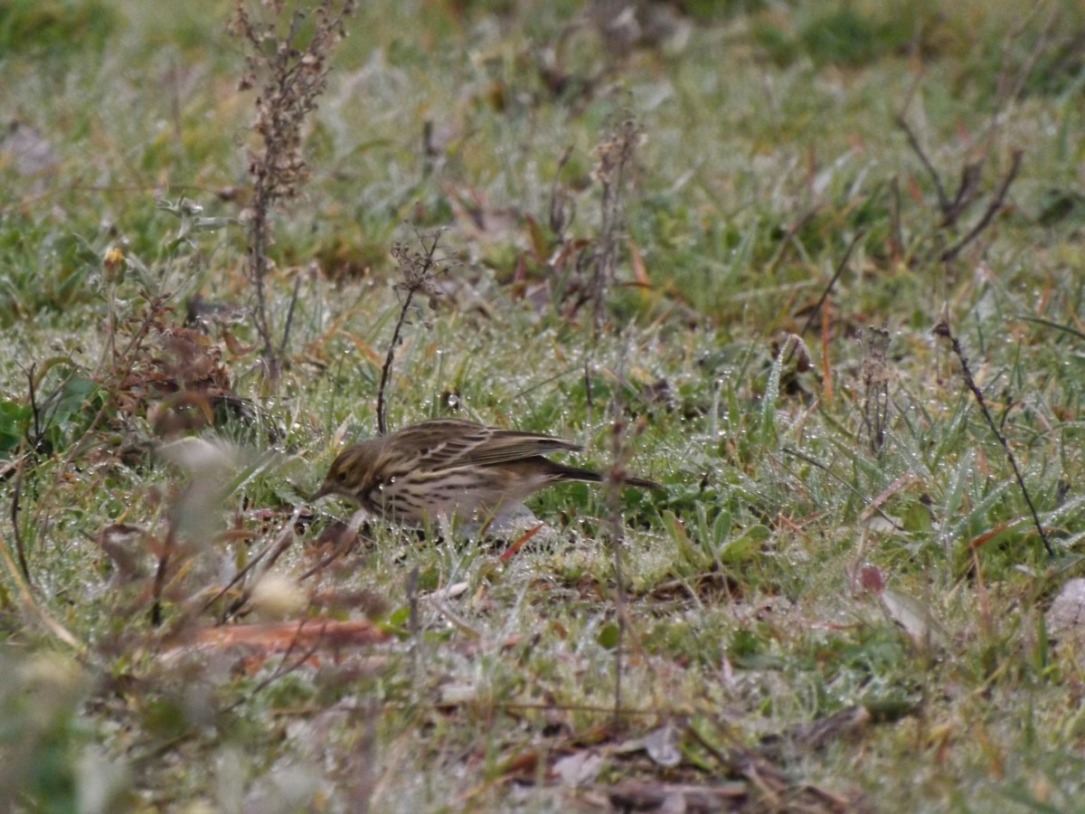 No chão uma petinha-dos-prados, uma ave que inverna por cá.
