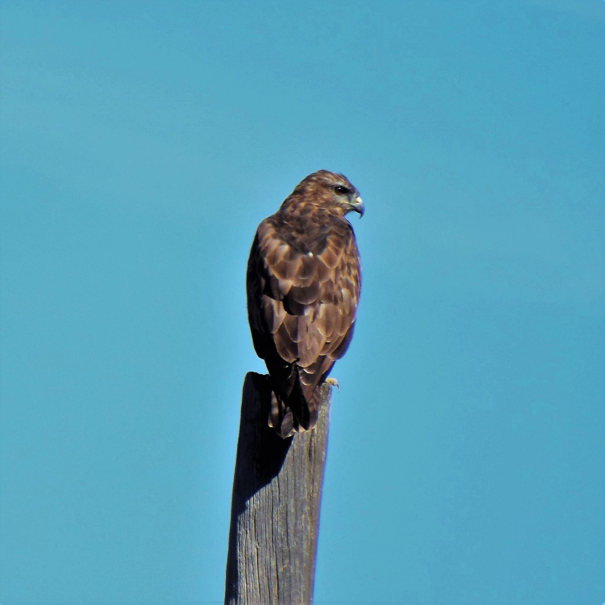 Águia-de-asa-redonda “Buteo buteo”, pousada no poste à beira da estrada.