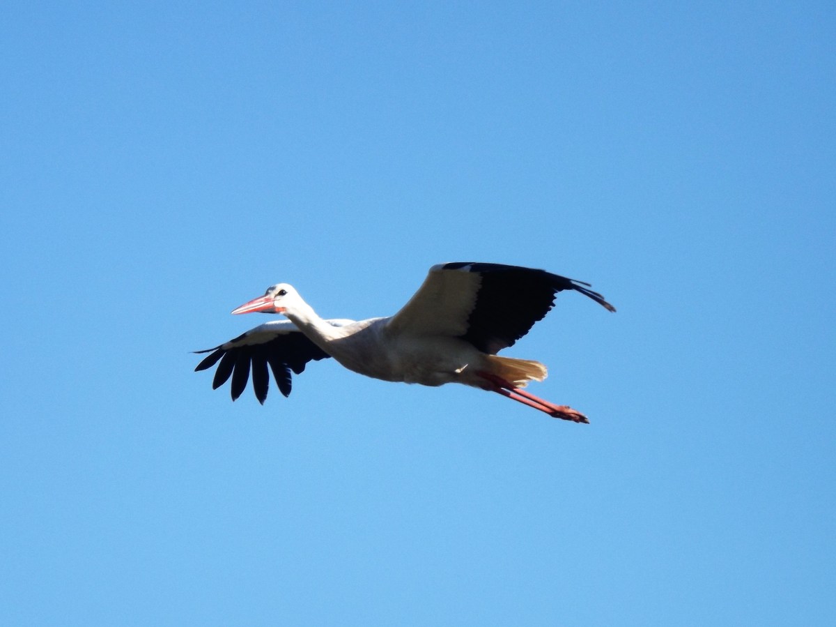 Uma cegonha-branca cruza os céus.