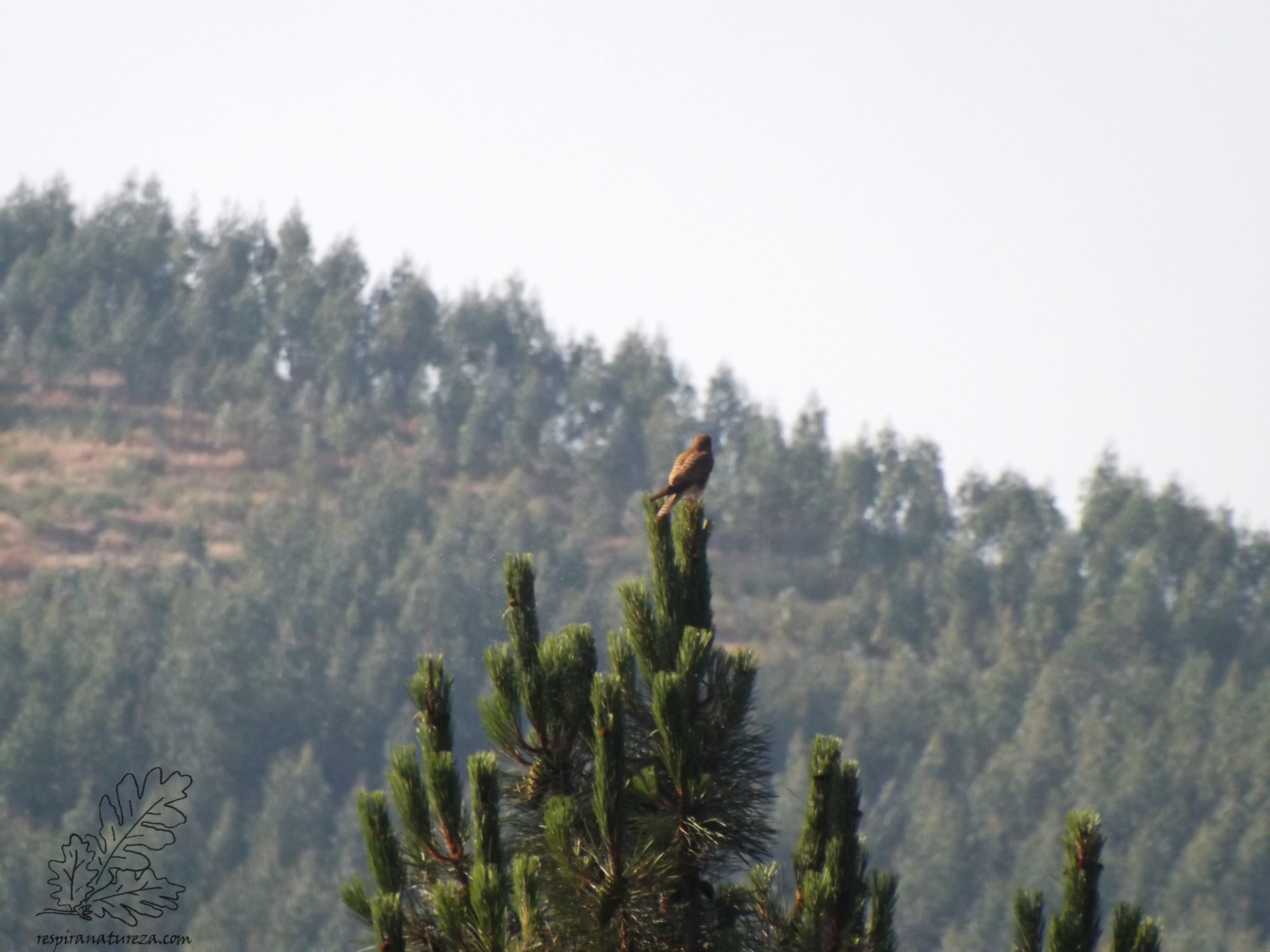Lá ao longe num pinheiro uma fêmea observa a paisagem.