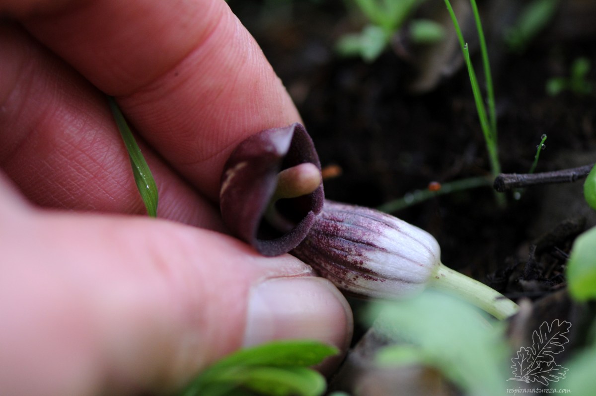Na “boca” do “capuz” espreita um espádice, e é nele que surgem estranhas “flores”.