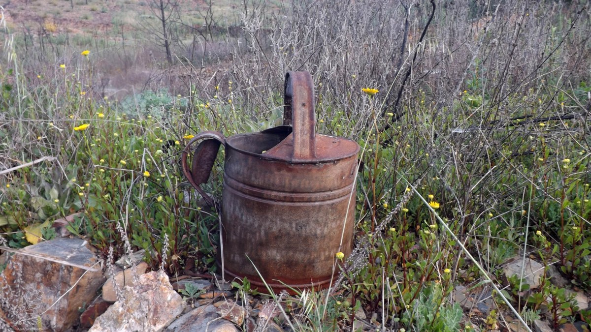 Um velho regador que há muito perdeu o dono ali permanece, em cima de um muro de pedra seca, levantado há muitos anos atrás. Pena estes não me contarem histórias e vivências…