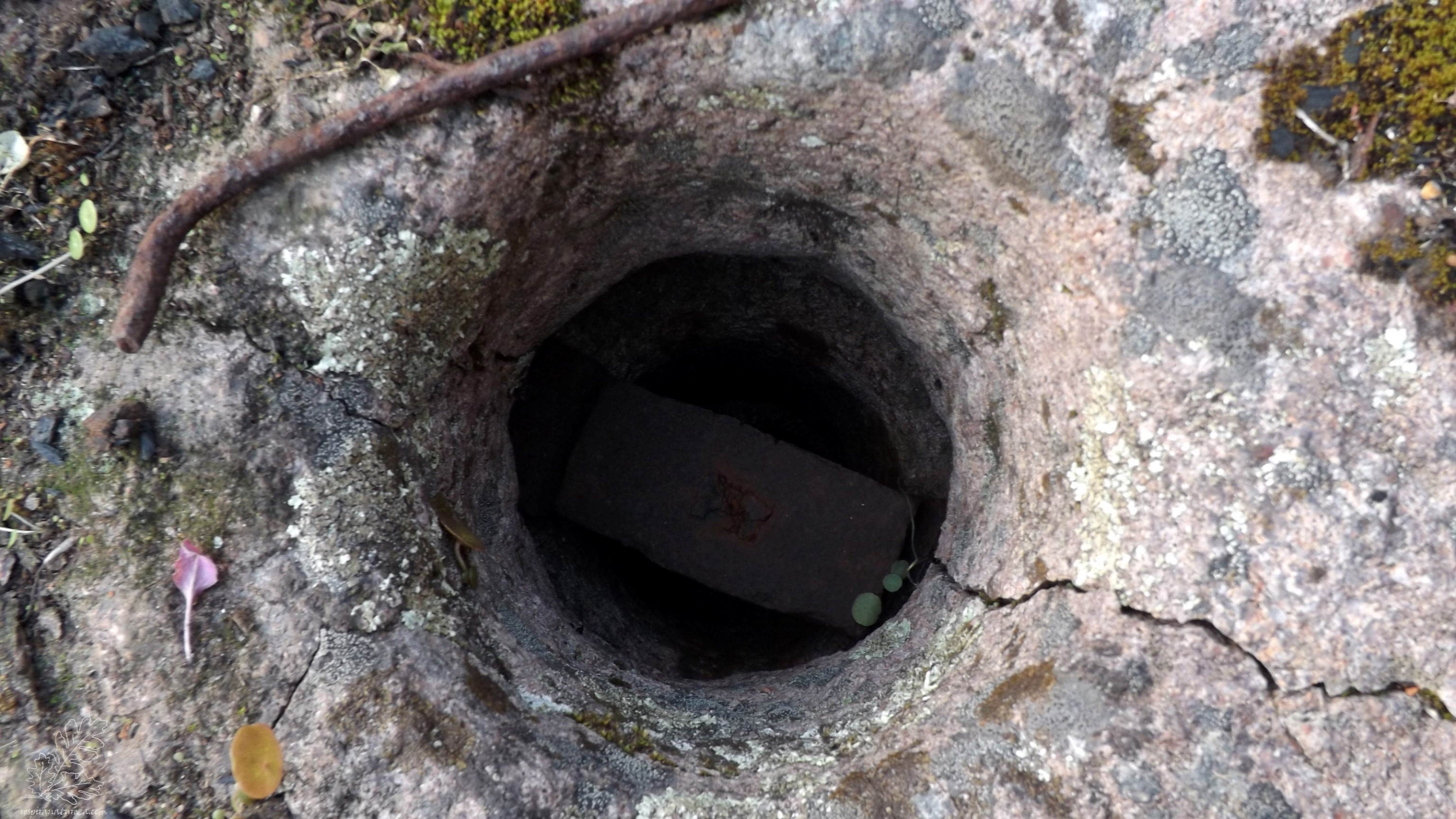 Lá em baixo vejo o veio que estaria ligado ao rodízio.