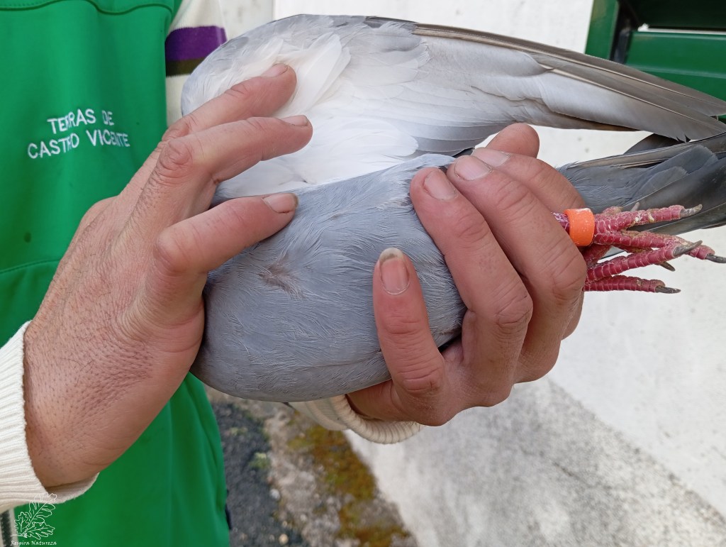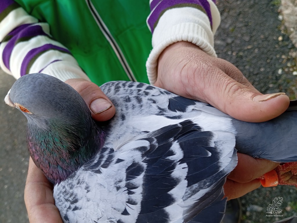 Logo ali, em conversa com o amigo Miguel falámos sobre algumas espécies, como o melro-azul desenvolvendo-se até aos pombos, e passado alguns minutos observámos um pombo doméstico descendente dos pombos das rochas selvagens (Columba livia). Este pombo tem praticamente as características do pombo das rochas, nomeadamente o uropígio branco, a contra-asa branca e duas riscas pretas bem visíveis na asa.
